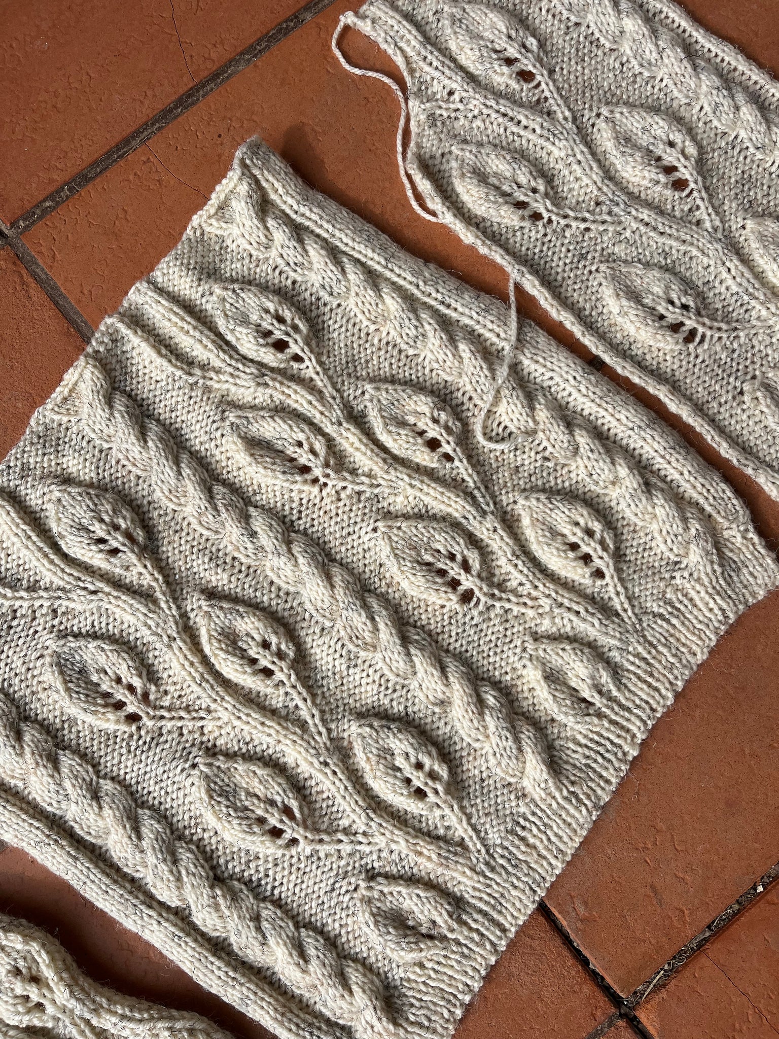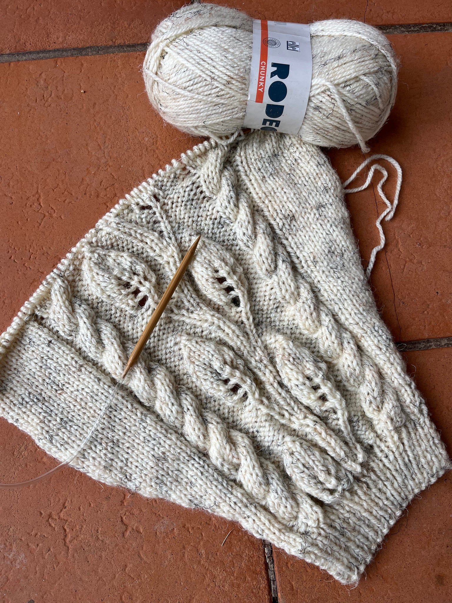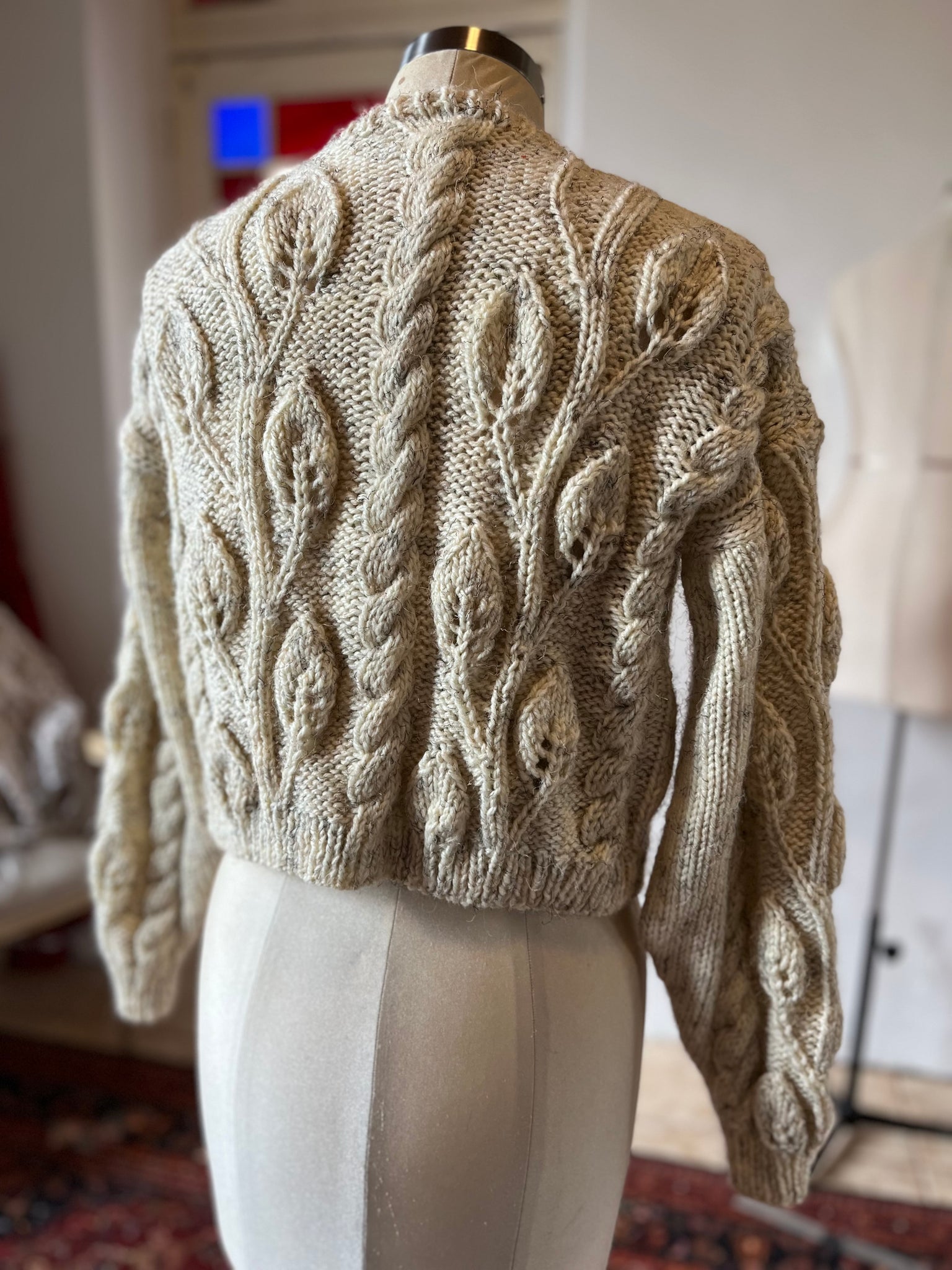 100% hand knit cardigan with a gorgeous leaf design and cabling.